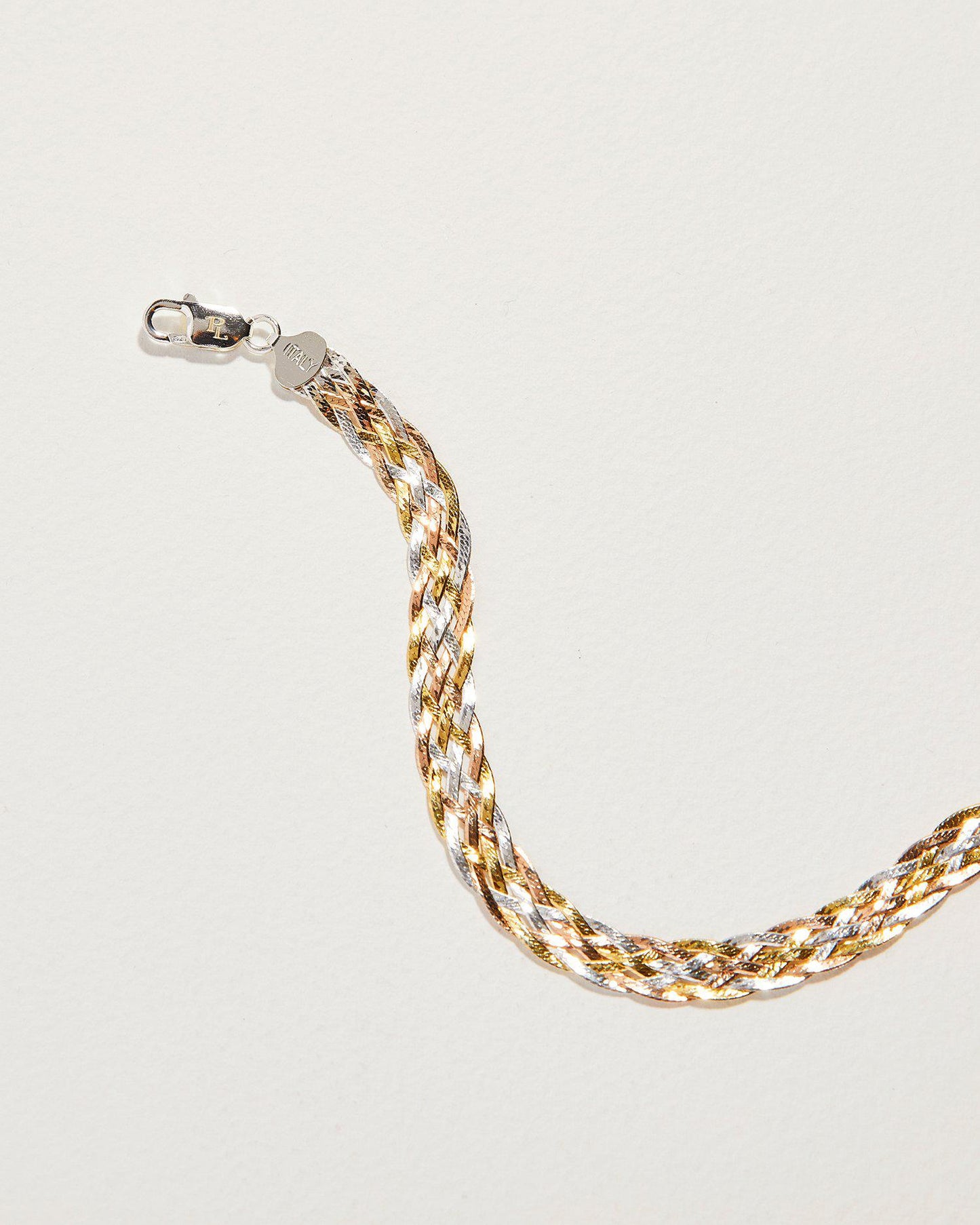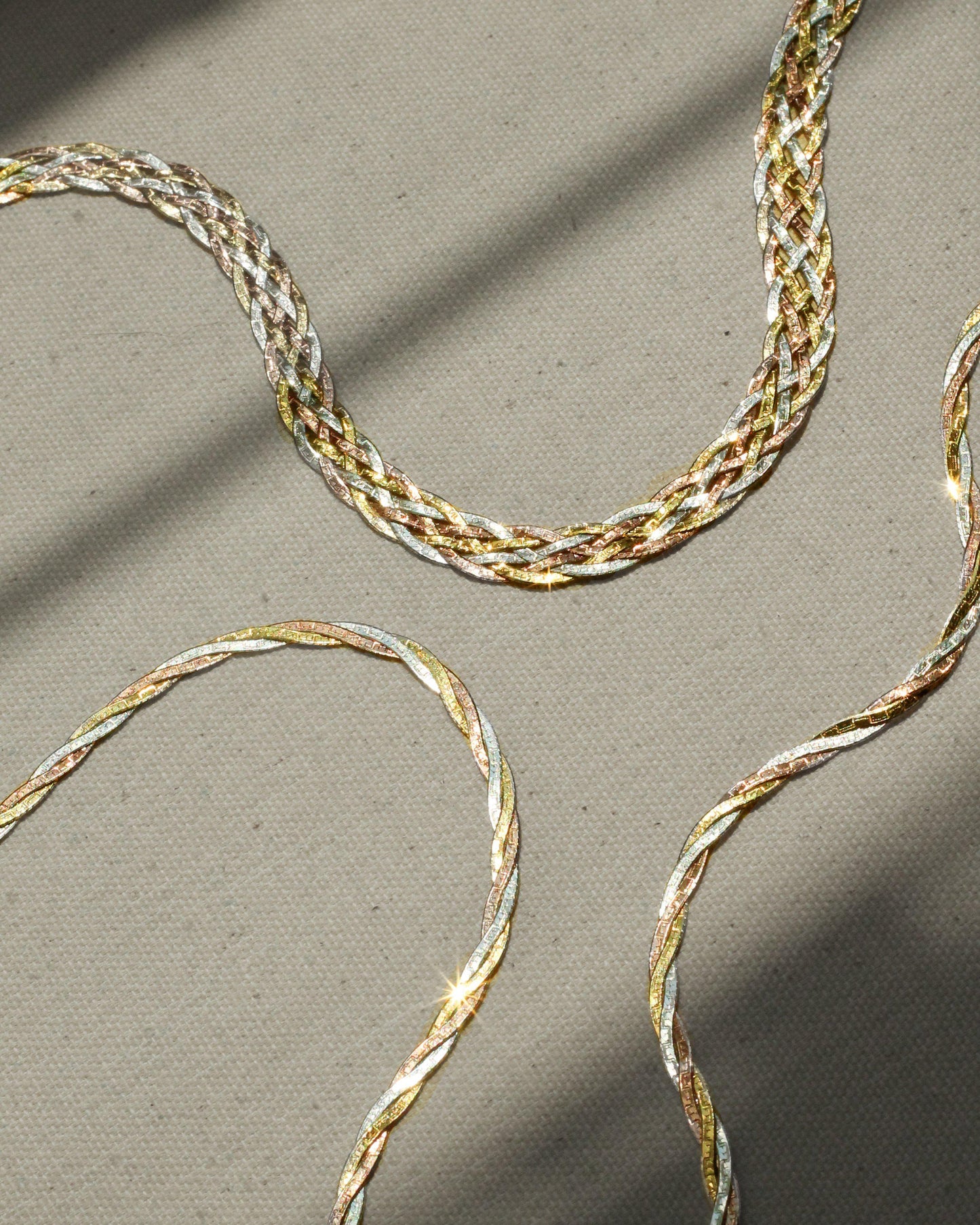 A thick herringbone chain with delicately twisted strings in yellow, rose and white gold. Made with love in Italy, these textural beauties fall perfectly along the collarbone for an effortlessly romantic look. This 14" adjustable necklace is high polished on one side and matte on the other, which allows for versatility.