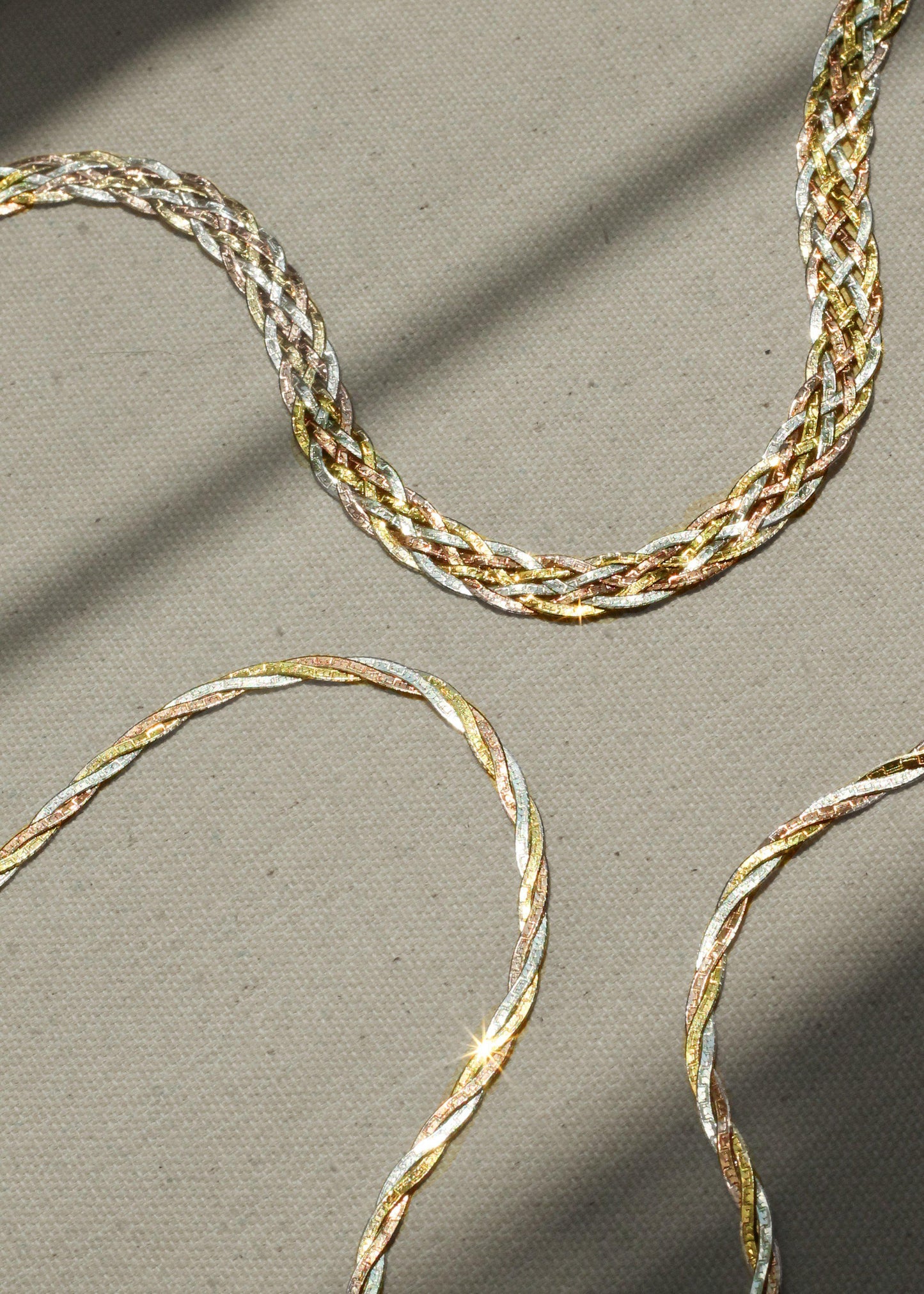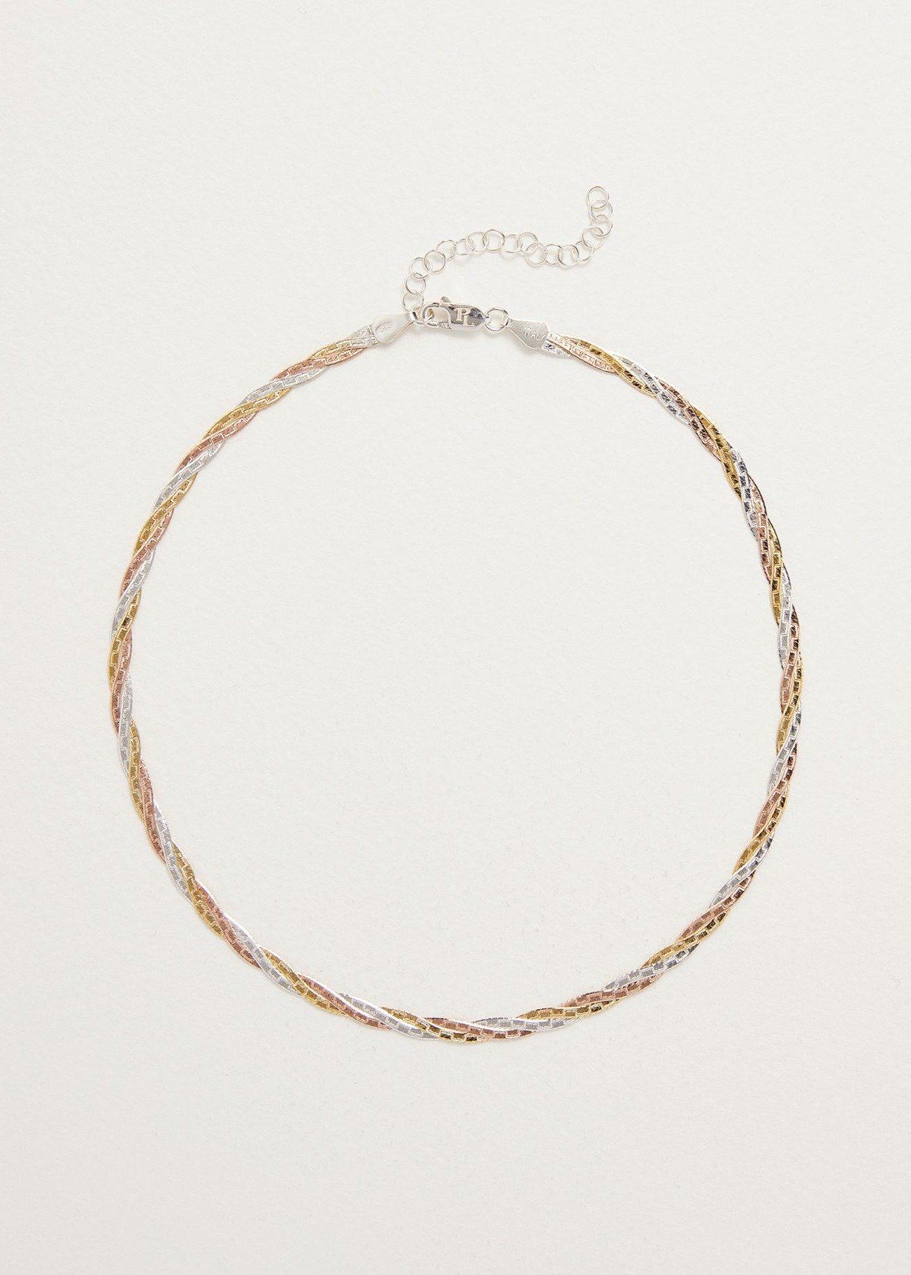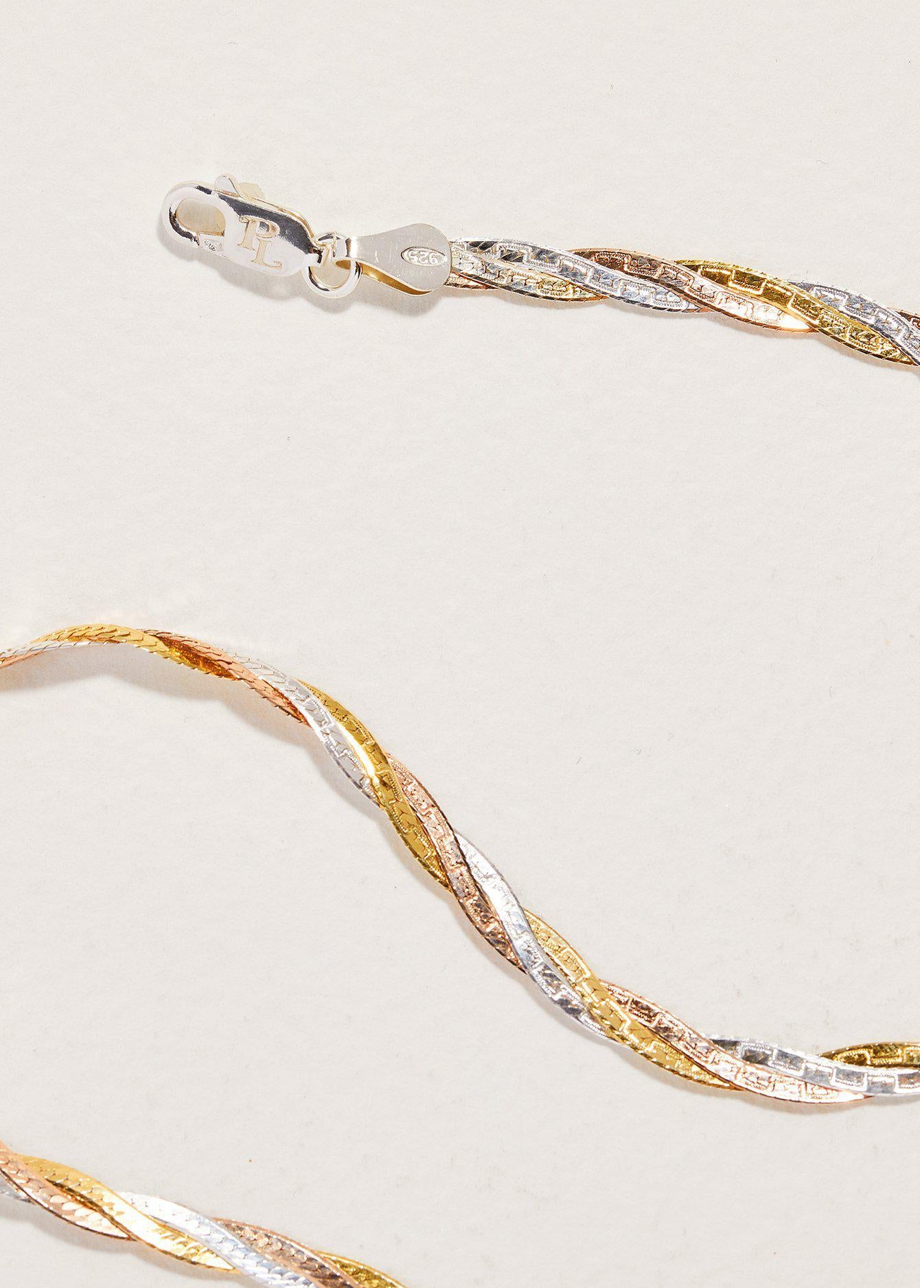 A versatile 14" herringbone chain with delicately twisted strings in yellow, rose and white gold. Made with love in Italy, these textural beauties fall perfectly along the collarbone for an effortlessly romantic look. The perfect layering necklace with a high polish finish on one side and an etched, matte finish on one the other.