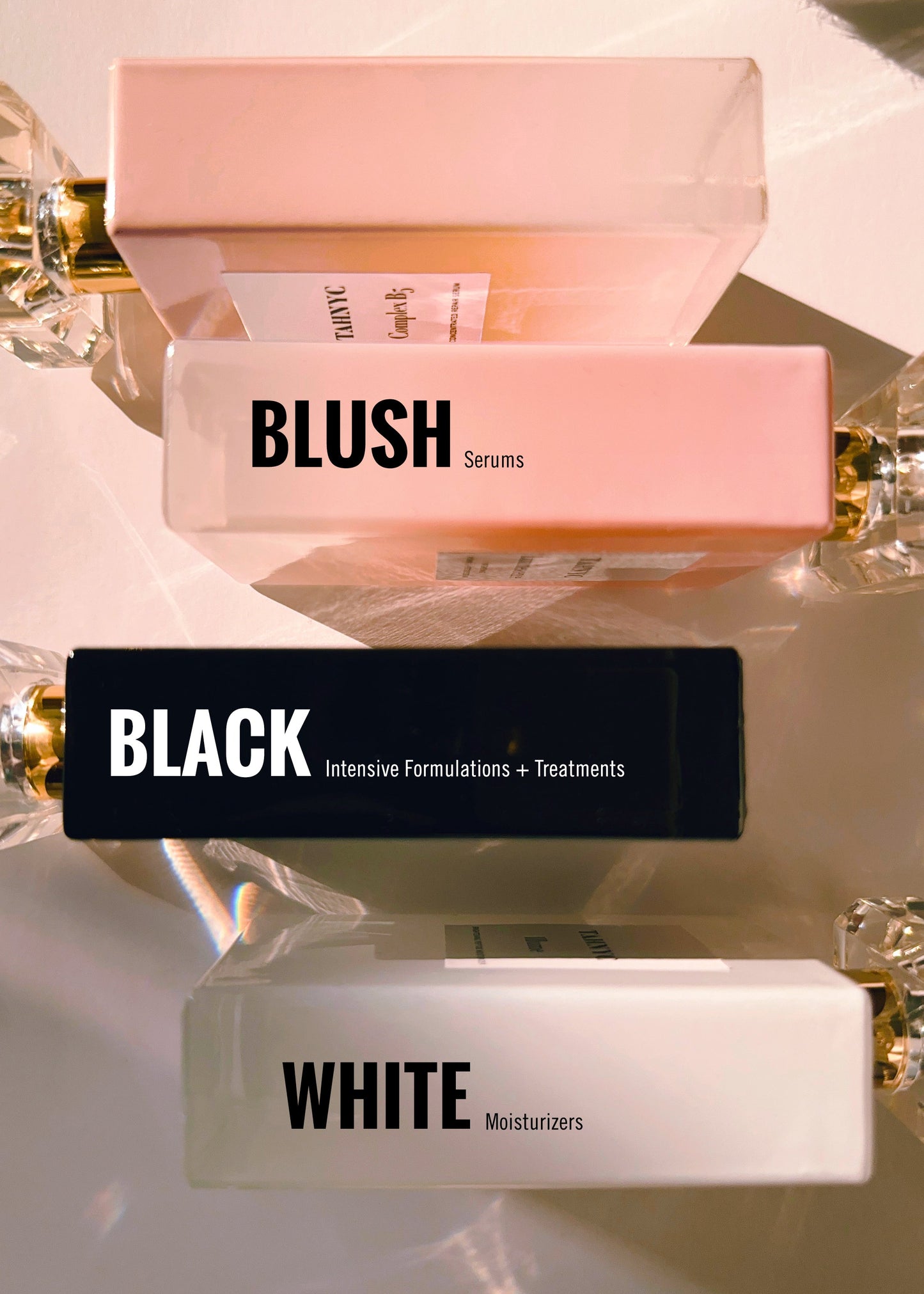 Two skincare product boxes, one labeled 'Blush' and the other 'White', with a black label in the center.