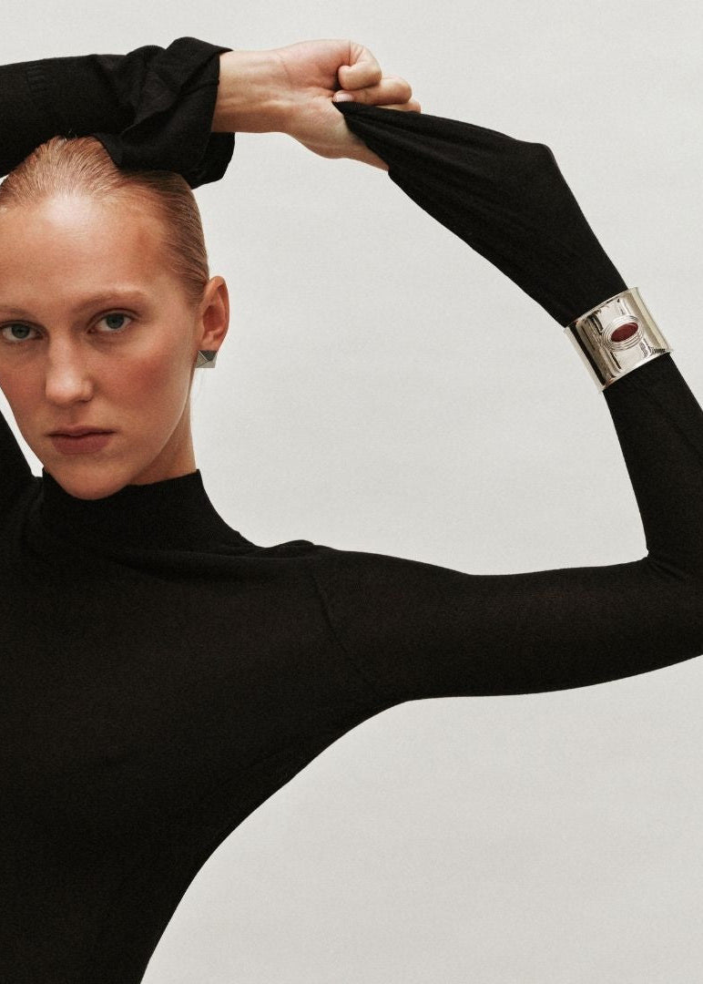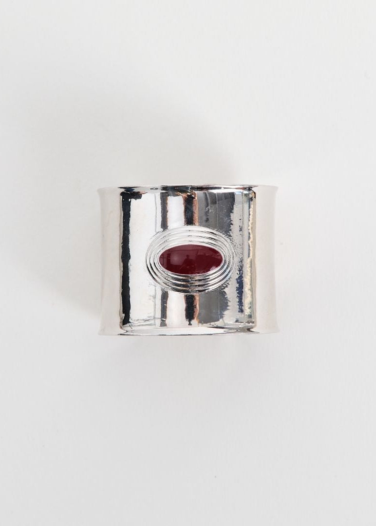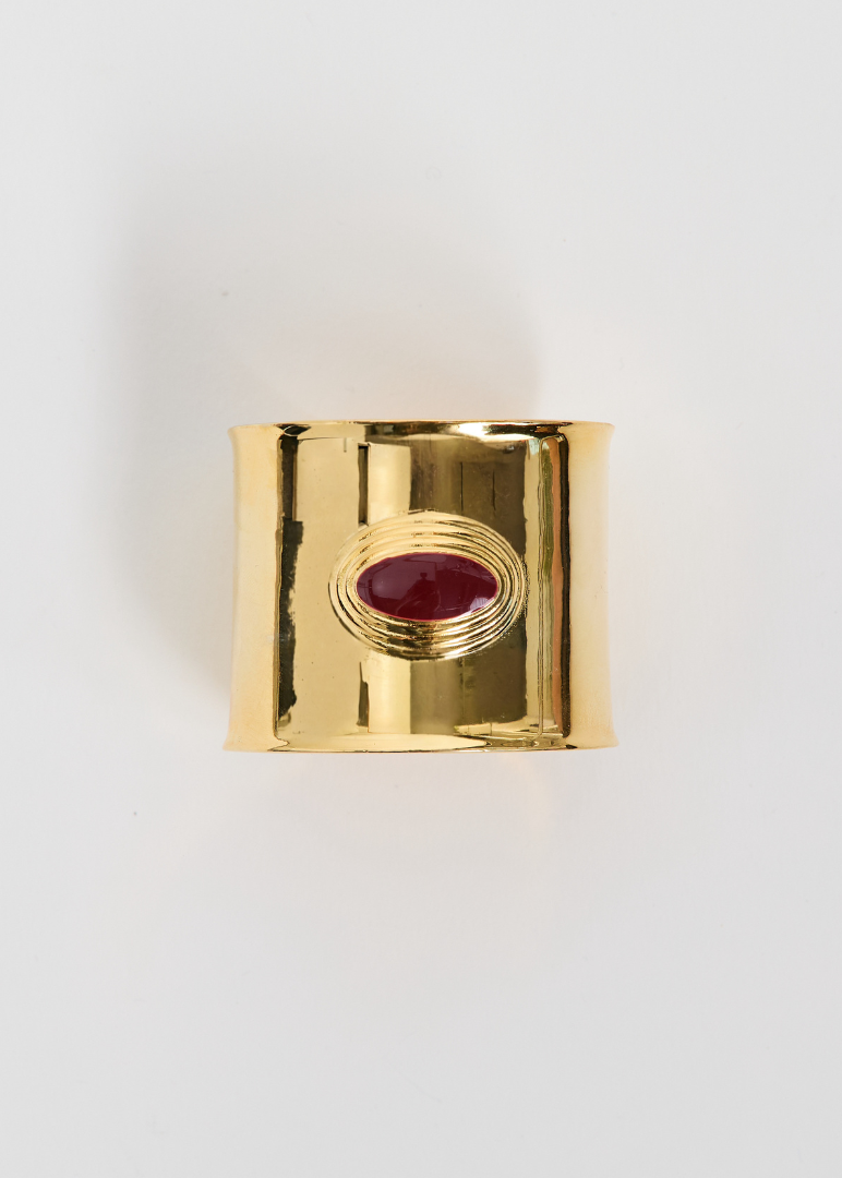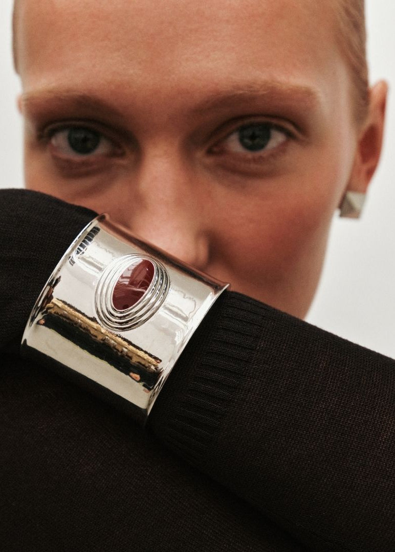 The Matilde Cuff embodies modern elegance with a bold, architectural form. Crafted from stainless steel and available in gold or silver finish, it features a deep burgundy enamel center that adds a striking note of color and depth.