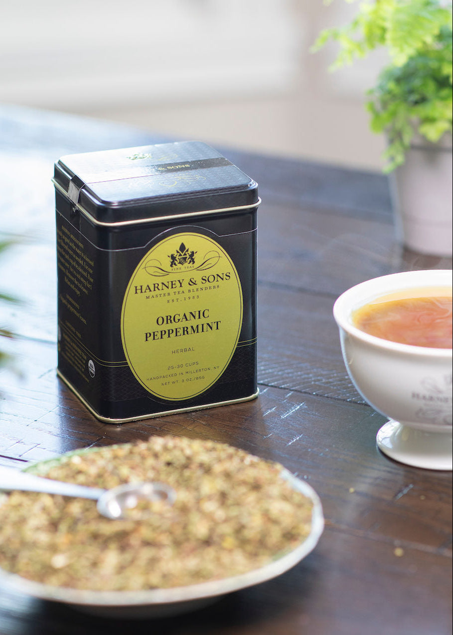 Peppermint has been enjoyed as an herbal brew for a long time. People appreciate its refreshing flavor, and it can help calm an overly active stomach. It can be chilled and used during the hot months. Harney & Sons peppermint leaves come from Oregon, and it is about the only tea or tisane that comes from the USA.